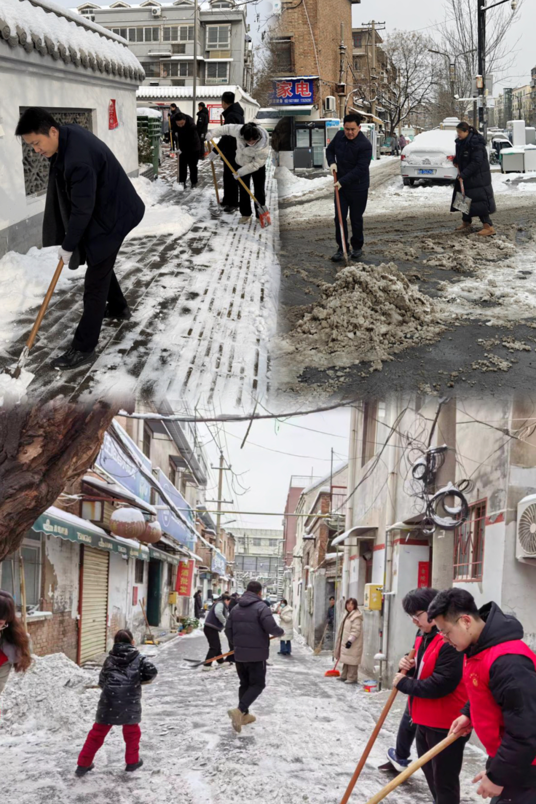街道全体人员下沉一线,携带铁锹、扫帚、雪铲等工具,聚焦居民小区、主次干道、商户集中路段以及背街小巷,实行“地毯式”清扫、“精细化”除冰,大家分工协作、干劲十足,有的挥锹破除路面坚冰,有的弯腰清扫残留积雪,有的沿街排查隐患点位,争分夺秒清除道路障碍,全力保障道路通行安全。在铲雪沿途中同时号召辖区居民与商户们积极参与,从小区居民到个体商户,从餐饮门店到零售商铺,大家不仅清扫自家门前积雪,还主动延伸清扫范围,为维护辖区环境与安全贡献力量。