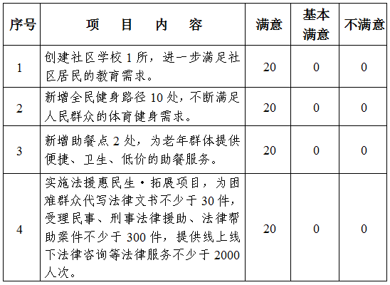 2025年2月28日,鼓楼区第十七届人民代表大会第五次会议票决产生了鼓楼区2025年十件重点民生实事项目。2025年12月29日,鼓楼区第十七届人大常委会第二十八次会议对区政府2025年十件民生实事项目推进情况进行了满意度测评。本次会议应到会常委会组成人员26人,实到20人,发出满意度评价表20张,收回20张,其中无效票0张,有效票20张。测评结果如下: