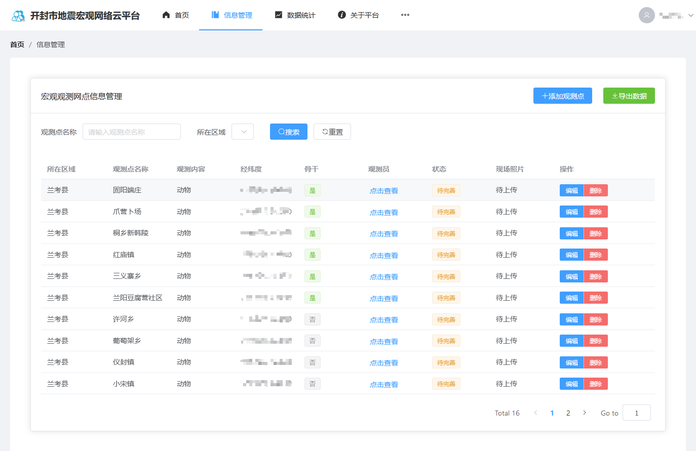 在日常管理方面,它可用于记录和维护观测点及观测员的日常信息,提高工作效率和准确性。在应急响应方面,当地震发生时,系统能够快速查找相关观测点和人员信息,为及时采取应对措施提供有力支持。在数据分析方面,平台为地震研究提供了基础数据支撑,为地震预测和防范工作提供科学依据。