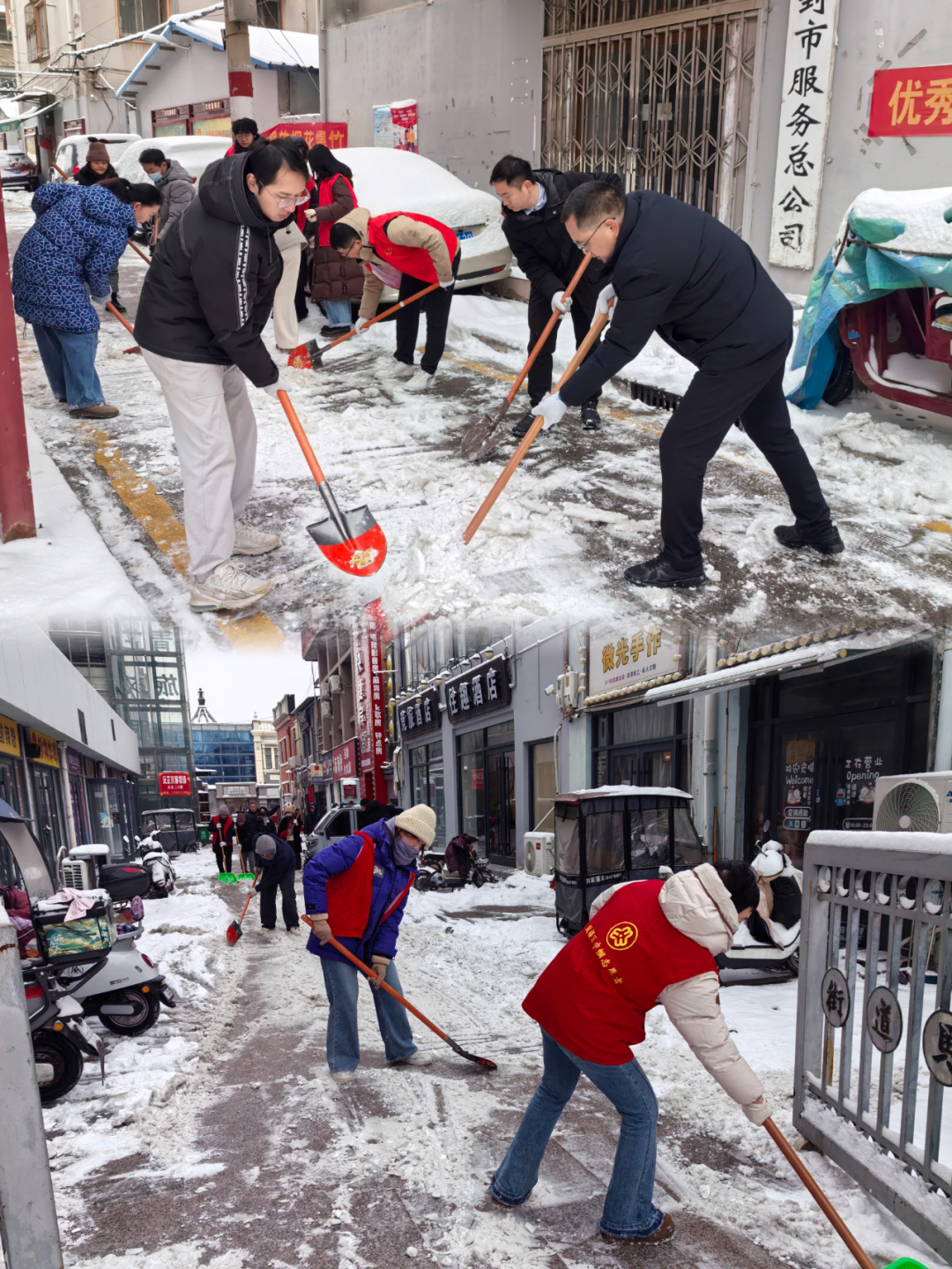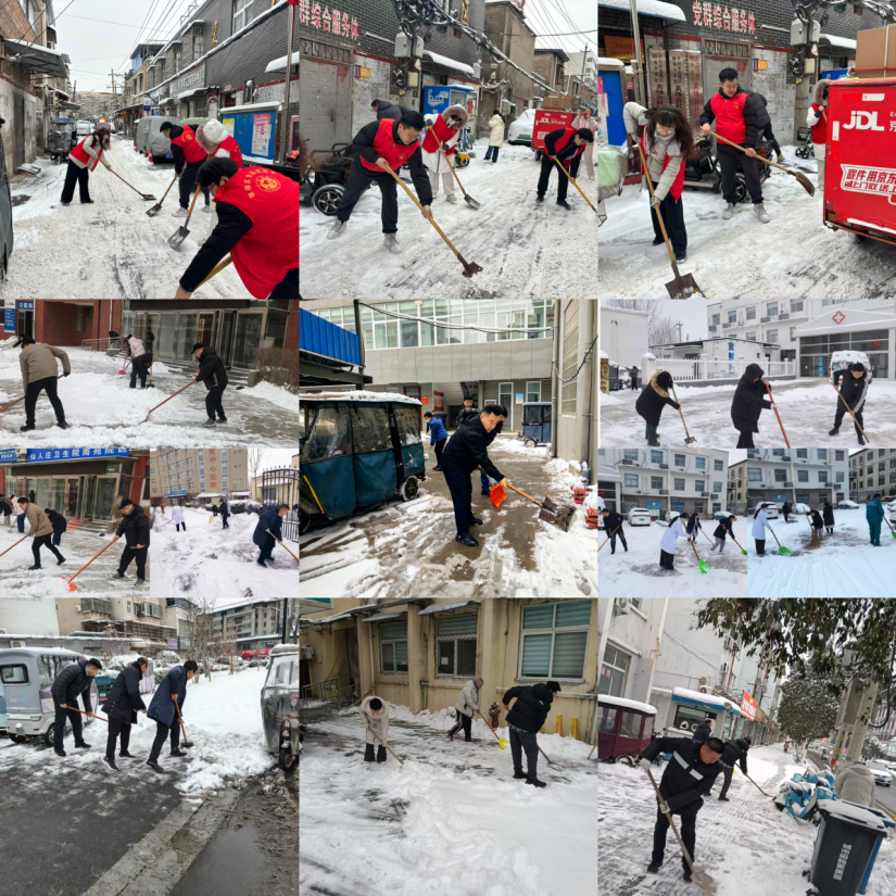 街道全体人员下沉一线,携带铁锹、扫帚、雪铲等工具,聚焦居民小区、主次干道、商户集中路段以及背街小巷,实行“地毯式”清扫、“精细化”除冰,大家分工协作、干劲十足,有的挥锹破除路面坚冰,有的弯腰清扫残留积雪,有的沿街排查隐患点位,争分夺秒清除道路障碍,全力保障道路通行安全。在铲雪沿途中同时号召辖区居民与商户们积极参与,从小区居民到个体商户,从餐饮门店到零售商铺,大家不仅清扫自家门前积雪,还主动延伸清扫范围,为维护辖区环境与安全贡献力量。